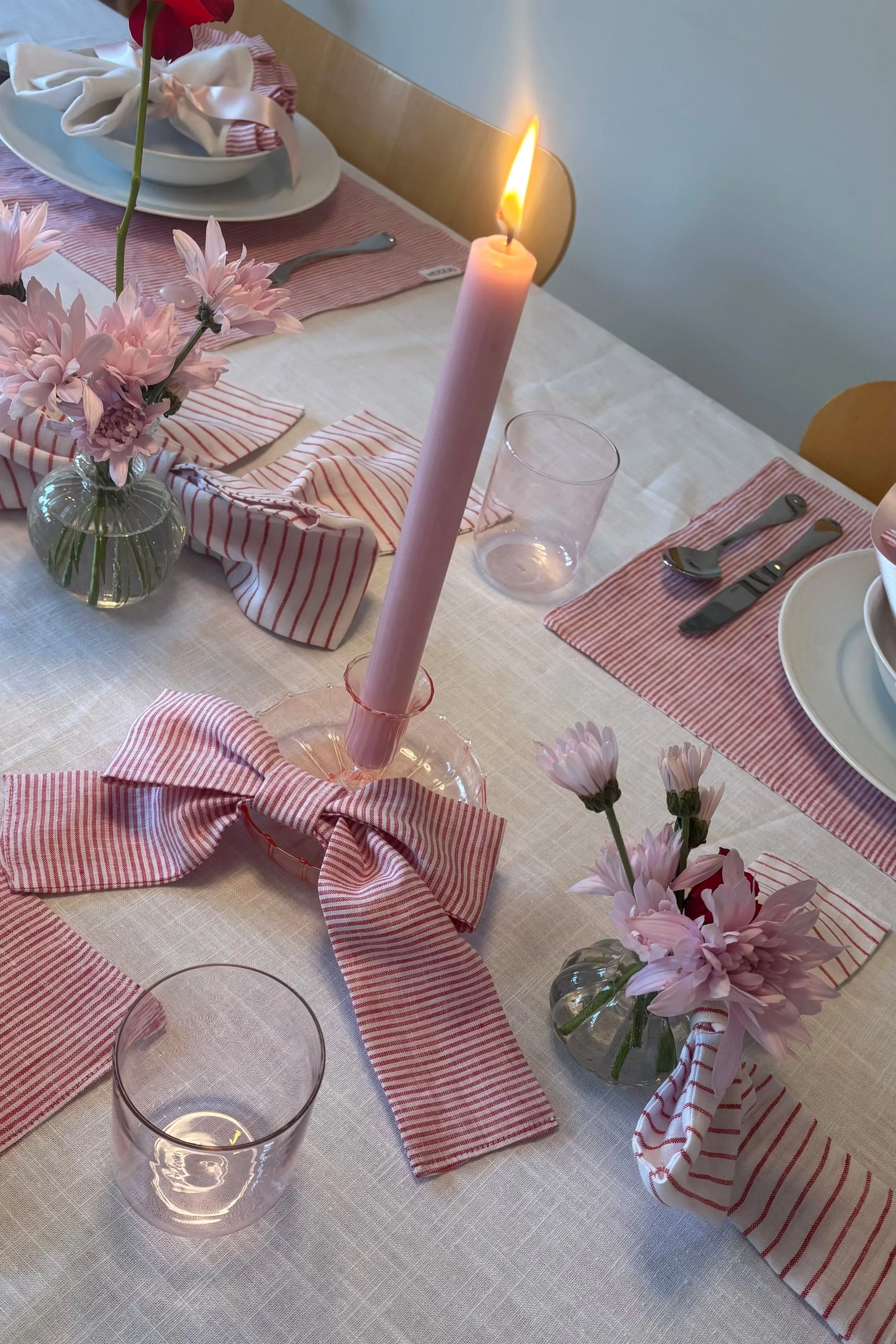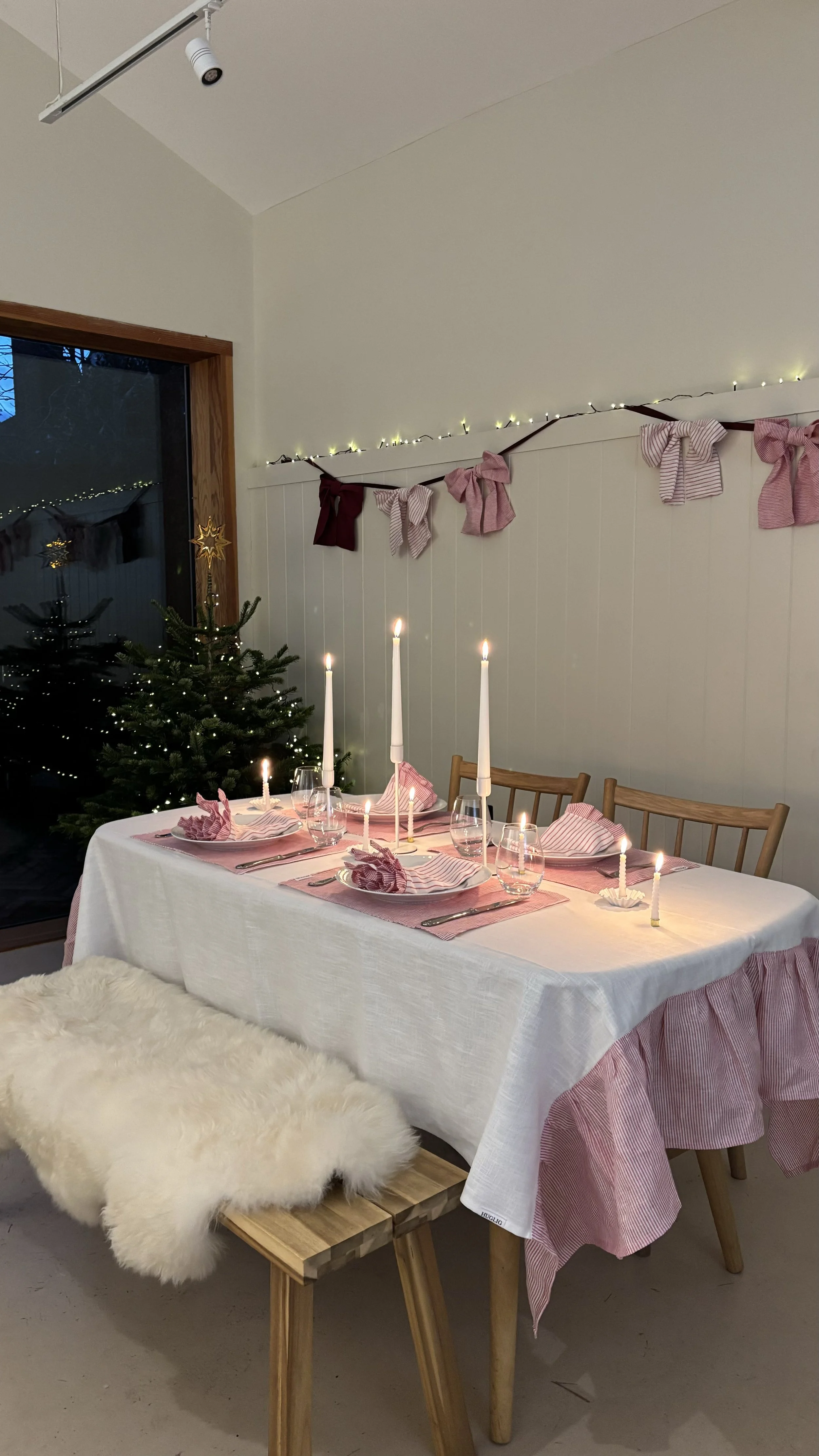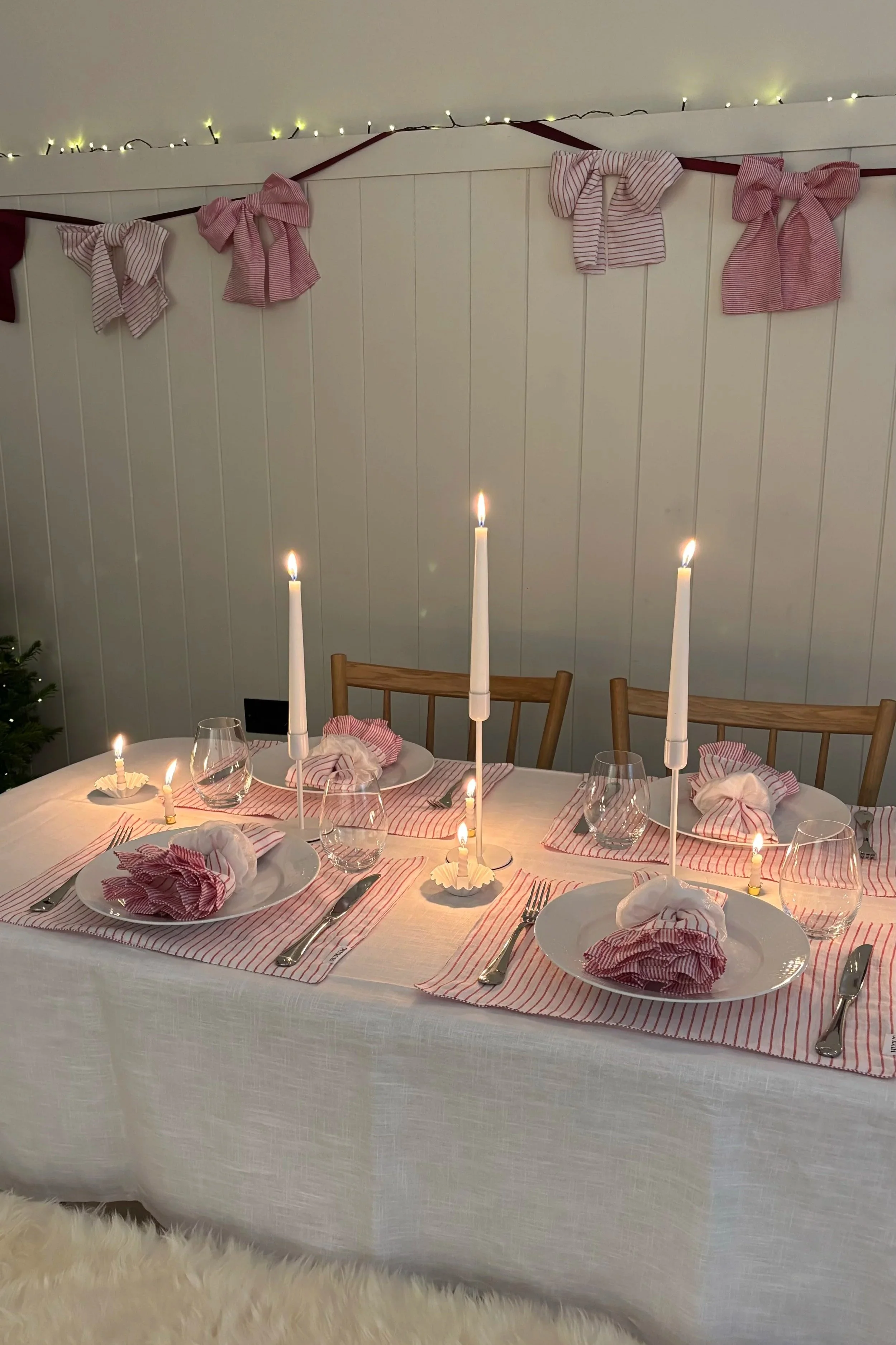 I had long dreamed of creating handmade table linens and coasters with a distinctly Scandinavian Christmas feel - something I had always struggled to find. Inspired by the festive whimsy of candy canes yet grounded in clean, timeless design, I crafted a collection of crisp linens edged with soft frills, weaving together the charm of Christmas with a pared-back Scandi aesthetic. Each piece felt like a little nod to tradition, while still carrying my own modern touch.
