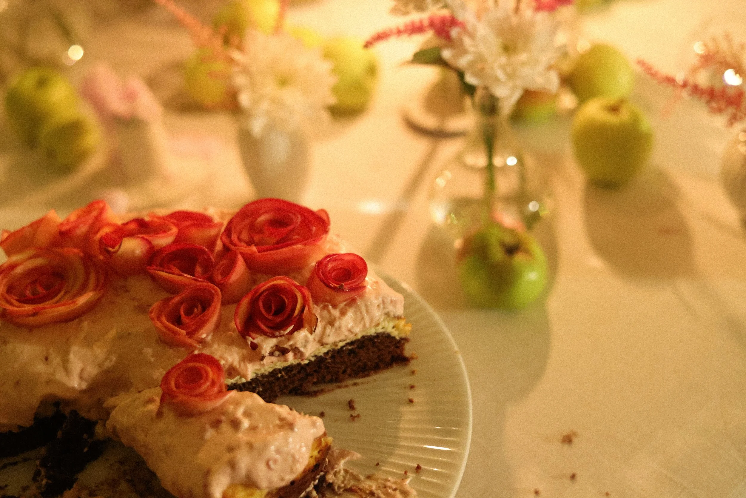 Dessert was a showstopper (and my personal favourite) a rich brownie raspberry cheesecake crowned with delicate, hand-crafted apple roses. It was as much a feast for the eyes as it was for the taste buds, and it felt like the perfect way to close the evening. Surrounded by the gentle glow of candlelight, the hum of conversation, and the beauty of friendship, the night became more than just a dinner, it was a celebration of simple pleasures, shared memories, and the magic that happens when people gather with love and intention.