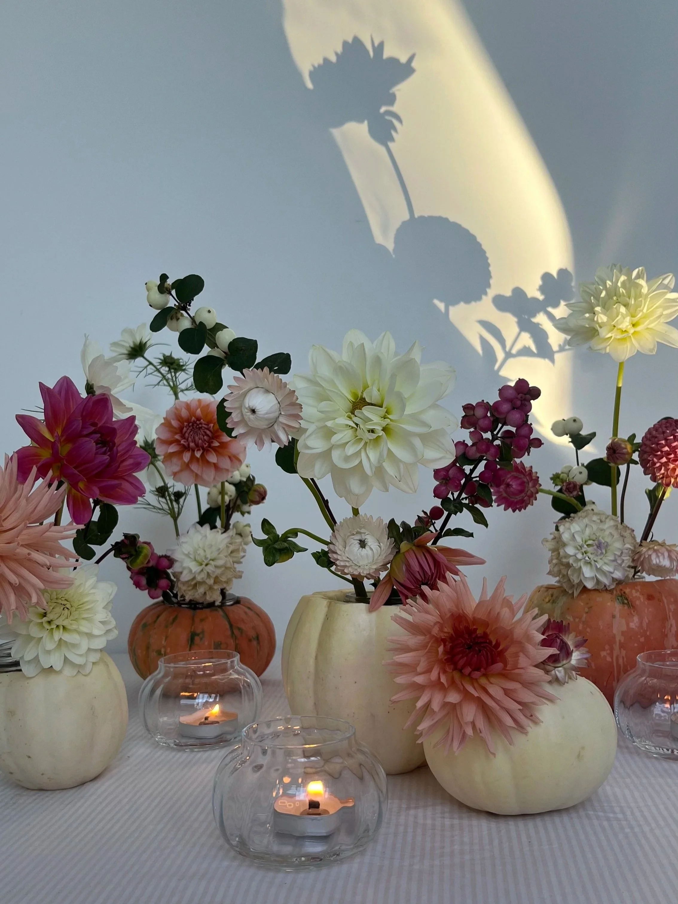 For a cosy autumnal activity, I visited a pumpkin patch and selected a variety of small pumpkins and squash. Carefully carving each one, I transformed them into unique vessels for vibrant dahlias, creating a warm, textured and sculptural display. Scattered around with small tealight candles, the arrangement glowed softly, enhancing the rich autumnal hues and adding a gentle, inviting warmth. The combination of seasonal produce, flowers, and candlelight made for a truly hyggelig experience, perfect for embracing the beauty and comfort of autumn.