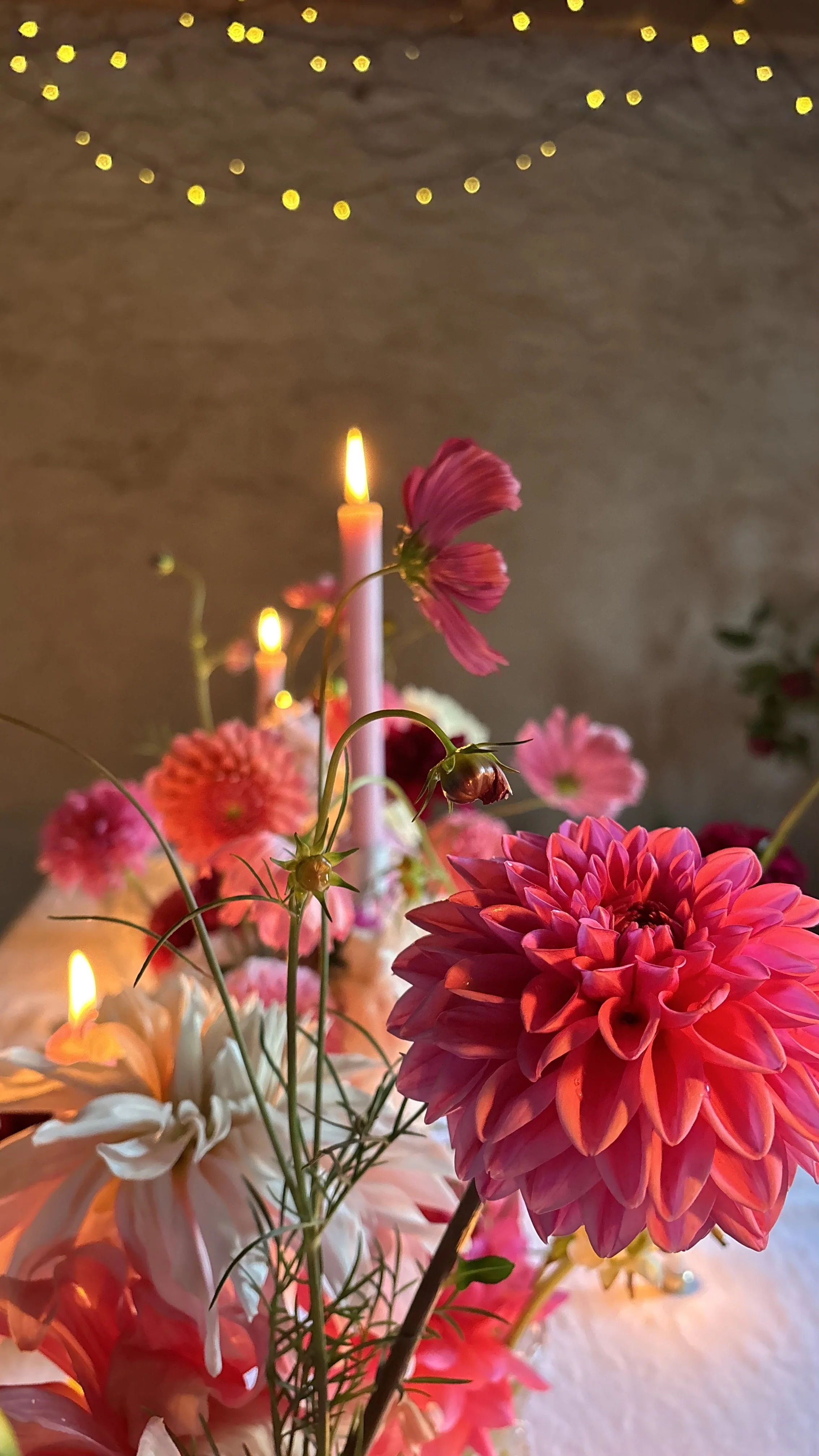 I transformed my old studio barn into a romantic, hygge-inspired space, ready to host a cosy autumnal dinner party. The room was filled with gorgeous shades of dahlias hand picked from Somerset Dahlias (a hygge experience in itself), flickering candles, twinkling fairy lights, and branches collected from the orchard, creating a warm and inviting atmosphere. Every corner felt intentional, from the textures to the soft glow that danced across the walls, inviting guests to pause, breathe, and enjoy the simple pleasures of the season.